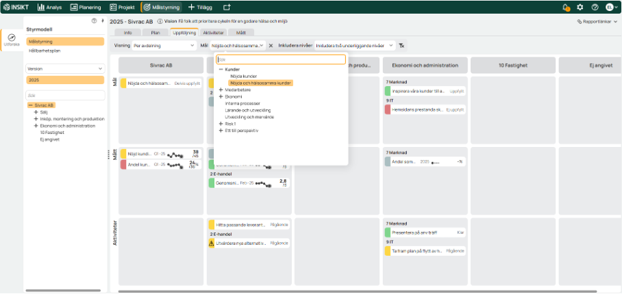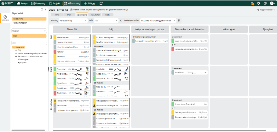 The new view makes it possible to compare several departments side by side. Each directly subordinate department is displayed as a heading with its goals, measures and activities, which provides a clear overview of how the work is progressing. You can also choose to include an additional underlying level to get a more complete picture of the organization's work.