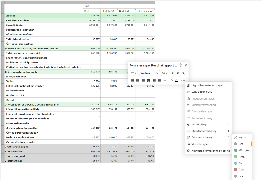 Reports can be made clearer with the new feature to highlight every other row. The report creator chooses a color and the report is automatically formatted with that color on every other row. Note that other formatting can be combined with this so we can simultaneously indicate the heading levels in the report. The images below show examples of this.