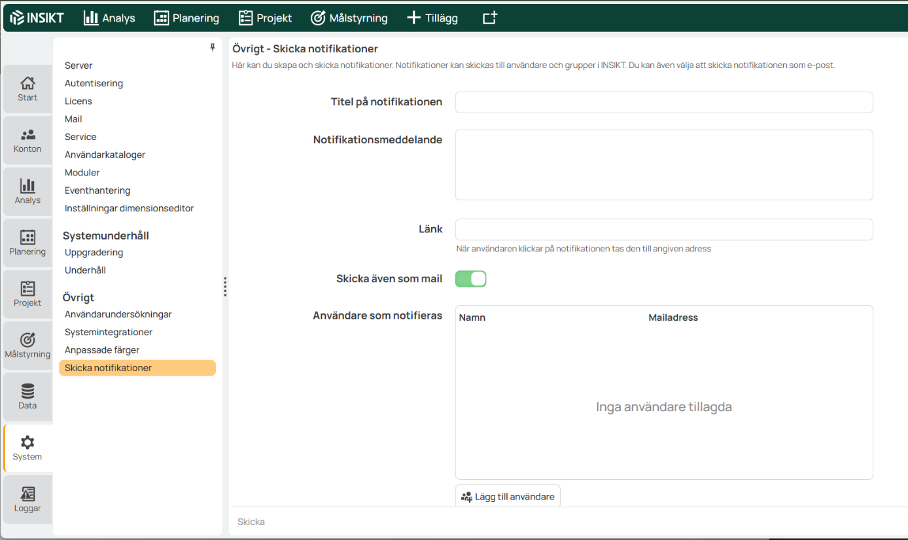 Administrators and consultants can send notifications to individuals and/or people in specific report groups. It is a good way to communicate with user groups within INSIKT about information about the business processes in the product. For example, to inform about a new budget version or a change in a project module.