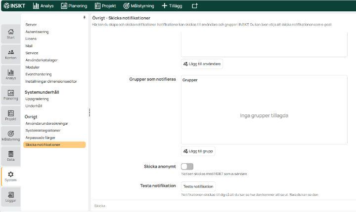 The notification is sent with a title, a message, a link (optional) and at least one recipient with the logged-in user as the sender. The notification can also be sent as an email to each recipient in addition to the system notification that is always sent. "Send anonymously" sends the notification with INSIKT as the sender. Testing the notification means that you yourself get the notification as it is formatted/configured sent to only yourself for the opportunity to see the end result before it is sent to the intended recipients.