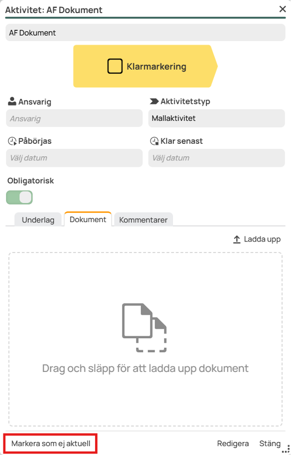 An activity that has been started, either through a clearly marked activity step or started mandatory sub-activities, cannot be marked as not current. The same applies to mandatory activities with started or clearly marked main activities and activities that are in completed project phases.
